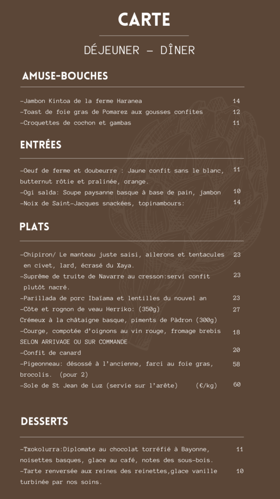 Pour le dîner, une carte courte pleine d’idées, bimensuelle. Entrées : 10-15€. Plats : 18-30€ dont 1 proposition végétarienne. Desserts 10€. Menu possible sur demande expresse (privatisation…).