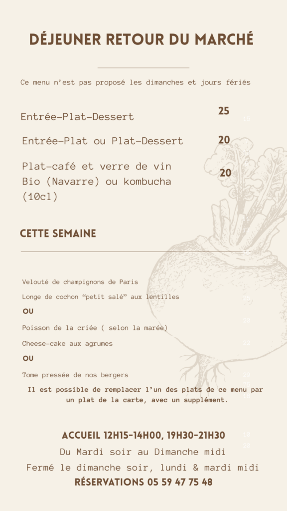 Nos plats sont communiqués à titre indicatif, mais peuvent changer, selon l’approvisionnement.